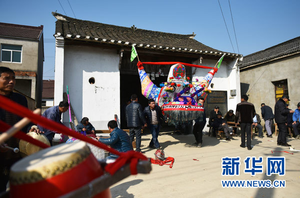 在鑼鼓聲中,村民們把制作好的龍頭搬運出來。(應(yīng)康偉 攝)