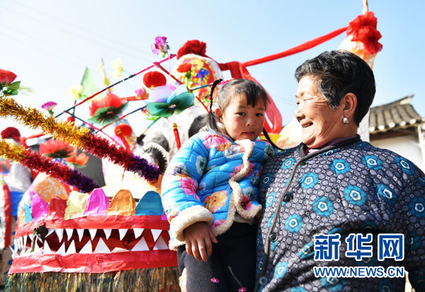 村里的老奶奶帶著小孫女來看舞龍。(應(yīng)康偉 攝)