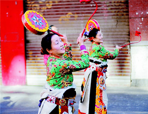 康定街頭的熱巴舞表演。 唐闖 攝