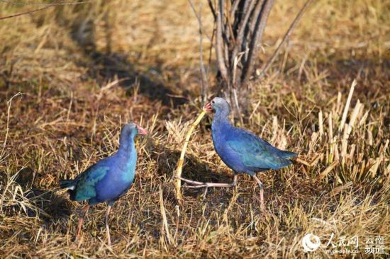 人民網(wǎng)大理2月3日電 近日,在云南大理洱海月濕地公園,50多只美麗的藍(lán)紫色水鳥吸引了游客的目光。經(jīng)辨認(rèn),這群精靈為紫水雞,其被稱為“世界上最美麗的水鳥”。紫水雞除尾下覆羽為白色外,全身羽毛均為藍(lán)紫色,腳呈暗紅色。