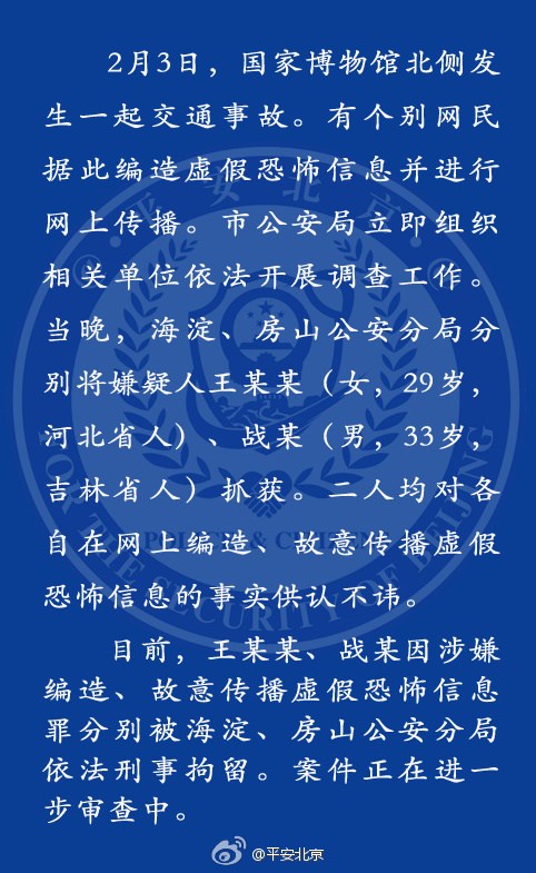 通報(bào)稱,2月3日國家博物館北側(cè)發(fā)生一起交通事故,有個別網(wǎng)民據(jù)此編造虛假恐怖信息并進(jìn)行網(wǎng)上傳播,北京市公安局立即組織相關(guān)單位依法開展調(diào)查工作。