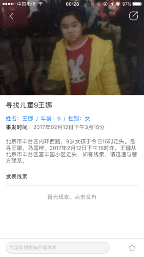 一條尋人信息下面設(shè)有“發(fā)表線索”區(qū)域