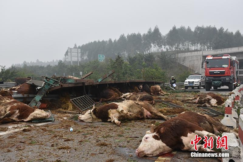 記者2月18日從重慶消防部門獲悉,當天上午11時許,重慶豐都G50S高速路高家鎮(zhèn)下道口匝道上,一輛滿載48頭牛的大掛車側(cè)翻在匝道上,造成車內(nèi)2人受傷,車上多數(shù)活牛被摔翻在周圍。事故造成該下道口暫時封閉。豐都消防大隊指揮中心接警后迅速出動前往現(xiàn)場,經(jīng)過40分鐘的緊張救援,成功將被困人員救出。黃華 攝
