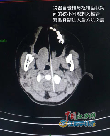 當(dāng)班醫(yī)生于第一時(shí)間請(qǐng)來(lái)擅長(zhǎng)治療上頸椎病的姚浩群副主任醫(yī)師會(huì)診。據(jù)姚主任根據(jù)CT平掃判斷,竹簽經(jīng)寰椎與樞椎齒狀突之間的狹小間隙刺入椎管,緊貼脊髓進(jìn)入后方肌肉層!爸窈炓呀(jīng)貫通椎管,并且所在的椎管正是呼吸、心跳等生命中樞所處的位置,因此如果進(jìn)行這一位置的異物取出,孩子隨時(shí)可能有生命危險(xiǎn)!蹦喜髮W(xué)第一附屬醫(yī)院姚浩群副主任醫(yī)師對(duì)王女士解釋道。