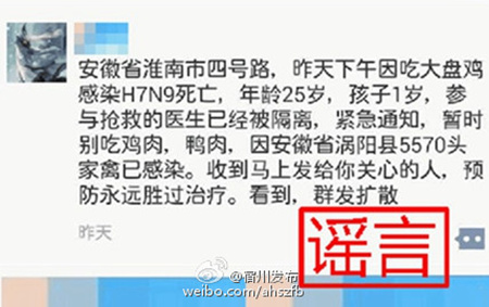 連日來,微博、微信朋友圈有消息稱:“淮南一市民昨天下午因吃大盤雞感染H7N9死亡,25歲,孩子1歲,參與搶救的醫(yī)生已被隔離,緊急通知,暫時別吃雞肉鴨肉。因安徽渦陽縣5570頭家禽已感染。收到馬上發(fā)給你關(guān)心的人,預(yù)防永遠勝過治療。看到,群發(fā)擴散。”19日,安徽省淮南市人民政府通過官方微博辟謠稱:“目前淮南市沒有發(fā)現(xiàn)人感染H7N9禽流感的死亡病例,朋友圈瘋傳的淮南市市民因感染H7N9病毒死亡的消息為假消息。