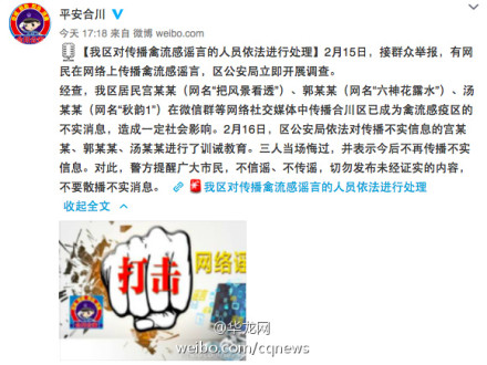 重慶合川3網(wǎng)民傳播禽流感謠言,被警方依法進行處理。重慶市合川區(qū)公安局官方微博@平安合川 發(fā)布通報,2月15日,接群眾舉報,有網(wǎng)民在網(wǎng)絡(luò)上傳播禽流感謠言,合川區(qū)公安局立即開展調(diào)查。經(jīng)查,合川區(qū)居民宮某某(網(wǎng)名“把風(fēng)景看透”)、郭某某(網(wǎng)名“六神花露水”)、湯某某(網(wǎng)名“秋韻1”)在微信群等網(wǎng)絡(luò)社交媒體中傳播合川區(qū)已成為禽流感疫區(qū)的不實消息,造成一定社會影響。