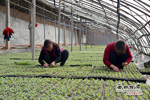 崆峒區(qū)花所鄉(xiāng)光明村育苗基地里產(chǎn)業(yè)工人正在給梨瓜分苗。 朱元軍攝