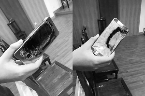 手機(jī)送到后,意外突然降臨。據(jù)姚某回憶,9月18日21時(shí)許,他拿著手機(jī)坐在家中床上玩游戲,手機(jī)突然震動(dòng),隨后手機(jī)屏幕發(fā)出“吱吱”的聲音,并冒出白色煙霧,姚某情急之中將手機(jī)扔在床上。接下來(lái)的一幕讓他更加恐慌:手機(jī)起火自燃,還散發(fā)出陣陣惡臭。事后,他發(fā)現(xiàn),涼席、床單、席夢(mèng)思床墊等均被燒出手機(jī)形狀的洞。