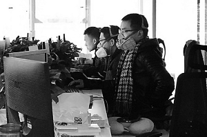 沿著數(shù)列長條形的辦公桌望過去,幾乎一半的員工都戴著口罩。午休時間,兩名女員工甚至戴著防毒面具,在座位上睡覺。記者發(fā)現(xiàn),戴有類似防毒面具的員工不下10人。