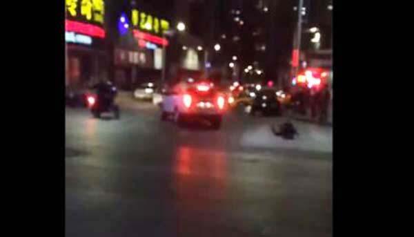 現(xiàn)場拍攝的一段視頻顯示,一輛白色小汽車撞向一輛出租車,路邊一男子試圖伸手拉住白色小汽車的車門使其停車,但白色小汽車并未就此停住,而是加速往前駛?cè)?致使拉車門男子摔倒在地,圍觀者驚呼。