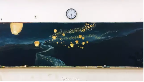黑板上是一幅水粉畫。夜幕下的長城上空,漫天的孔明燈正徐徐升起。