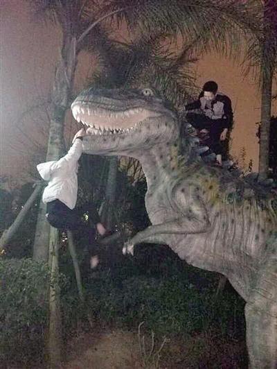 在周先生提供的照片里記者看到,一位身穿黑色上衣、約10多歲的男孩,一只腳踩在恐龍的前爪上,雙手緊緊的抓住恐龍的嘴時不時的往上攀爬。見他攀爬,另一個10多歲的小孩也加入了攀爬的隊伍中。
