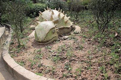 其中一處新種上的草又被前去拍照的人踩得一片狼藉,所有恐龍的身上都有長期攀爬磨損的痕跡,其中一只恐龍碎掉的前爪用水泥粘好。