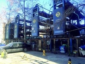 日前,記者來(lái)到工體南路小區(qū),劉先生所說(shuō)的立體車庫(kù)就在工體南路小區(qū)門口的停車場(chǎng)內(nèi)最東側(cè),四個(gè)高度超過(guò)十幾米的立體車庫(kù)并排擺放,共占地上百平方米。每個(gè)車庫(kù)上有8個(gè)停車坪,可供32輛汽車停放。但目前這些立體車庫(kù)均成“空架”,外殼、鋼管都銹跡斑駁,內(nèi)部零件和設(shè)備凌亂散落。最低一層和周圍的地面上堆滿冰柜、舊家具、酒瓶紙箱等雜物,別說(shuō)停放車輛,連落腳都難。車庫(kù)旁邊的兩三個(gè)簡(jiǎn)易房還住著人,自稱從事貨運(yùn)配送工作,對(duì)立體車庫(kù)的情況一無(wú)所知,“我們來(lái)的時(shí)候這兒就已經(jīng)是這樣了,好多年了”。