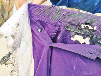 昨天上午10時,記者見到了這些被損壞的衣物。牧先生拿著一件被絞了11個口子的紫色T恤說,他平時利用業(yè)余時間,在朋友圈里賣一些衣物。今年2月4日,因客戶需要,他通過申通快遞的業(yè)務(wù)員,把兩件國外進(jìn)口的T恤衫、一個手提皮包和一只旅行水壺,從鄭州市中原區(qū)寄給住在二七區(qū)的客戶。2月7日,他接到申通快遞員的電話,說這些衣物被拒收退貨了。他與客戶取得聯(lián)系后,對方十分氣憤,說他寄來的衣物,包裝袋上全是機(jī)油,里面的衣服有多處爛口子,皮包上有明顯的劃傷,金屬水壺也癟了一個大坑。