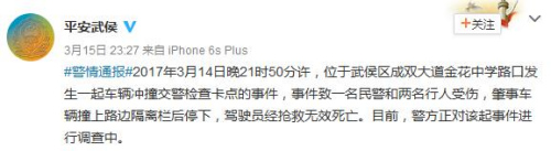 中新網(wǎng)3月16日電 據(jù)成都市公安局武侯區(qū)分局官方微博消息,2017年3月14日晚21時50分許,四川成都武侯區(qū)成雙大道金花中學路口發(fā)生一起車輛沖撞交警檢查卡點的事件,事件致一名民警和兩名行人受傷,肇事車輛撞上路邊隔離欄后停下,駕駛員經(jīng)搶救無效死亡。