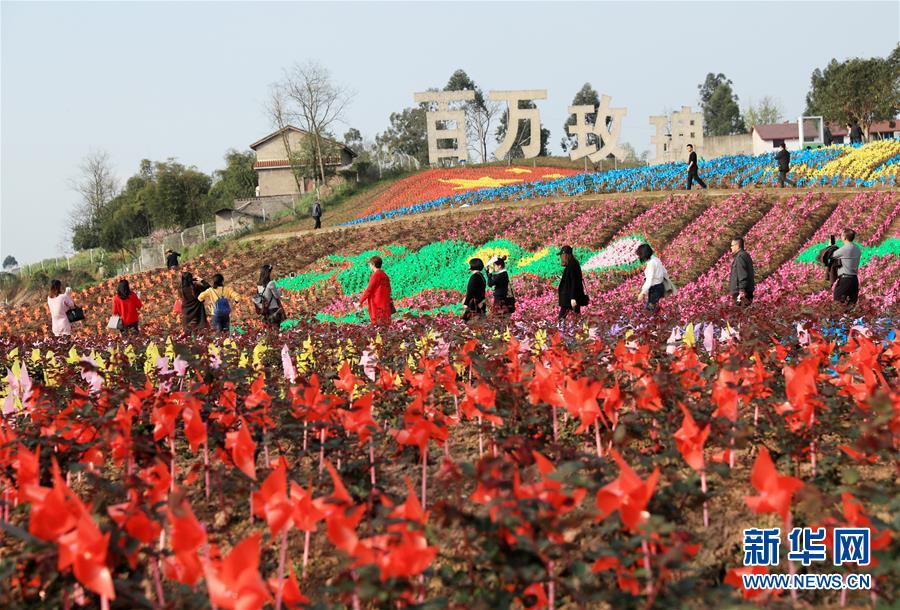 3月20日,游客在四川省華鎣市祿市鎮(zhèn)涼水井村參觀風車。今年春天,華鎣市祿市鎮(zhèn)涼水井村一生態(tài)園的農(nóng)民在200多畝土地上“種”下30多萬只造型各異的風車,讓五彩繽紛的風車把山村點綴得更加美麗。新華社發(fā)(邱海鷹 攝)