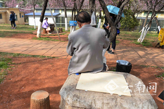 時值櫻花盛開,昆明動物園游人如織。不過記者發(fā)現(xiàn),供游人休息的石桌石凳變成了麻將桌,有的還收費。
