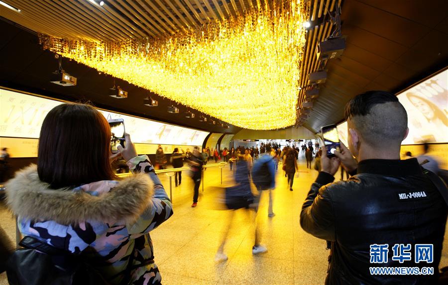 3月22日,市民在換乘通道用手機拍攝金色燈帶。近日,上海地鐵徐家匯站1號線、9號線和11號線的換乘通道內(nèi)安裝了一條長約20米的金色燈帶,在換乘通道內(nèi)營造出一種奇幻的光影效果,為趕路市民的旅途增添了一抹亮色。新華社記者方喆攝