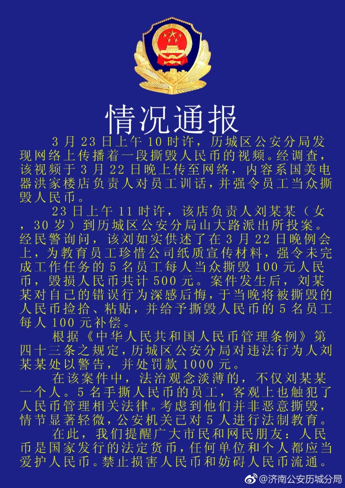 中新網(wǎng)3月23日電 據(jù)濟(jì)南市公安局歷城區(qū)分局官方微博消息,今日,歷城區(qū)公安分局就網(wǎng)上傳播的一段撕毀人民幣的視頻進(jìn)行調(diào)查。調(diào)查結(jié)果顯示,視頻內(nèi)容系國美電器洪家樓店負(fù)責(zé)人對員工進(jìn)行訓(xùn)話,并強(qiáng)令員工當(dāng)眾撕毀人民幣。歷城區(qū)公安分局對違法行為人劉某某處以警告,并處罰款1000元。