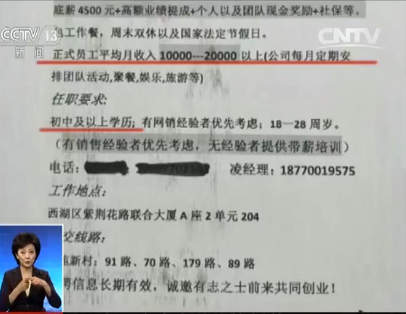 陪人微信聊聊天,就能月入輕松兩三萬(wàn),這樣的工作去哪找?在一家名為杭州深言商貿(mào)公司的招聘廣告上,從投資顧問(wèn)到市場(chǎng)經(jīng)理、行政助理,就號(hào)稱(chēng)有大量這樣的崗位。求職者只需初中學(xué)歷,填寫(xiě)一份簡(jiǎn)單的資料,便可上崗。待遇非常豐厚,月工資超過(guò)兩萬(wàn)。
