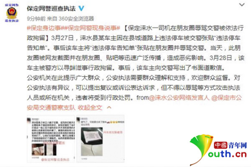 上午10點36分,保定市公安局網(wǎng)絡安全保衛(wèi)支隊發(fā)布通告,稱此信息被網(wǎng)友截圖并在朋友圈、貼吧等迅速廣泛傳播,造成惡劣影響。3月28日,該車主因尋釁滋事被警方行政拘留。事后,該車主寫出了書面道歉信。