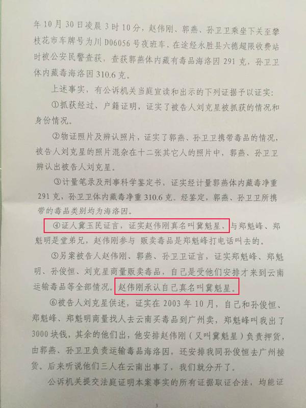 2005年6月15日,劉克星以販賣毒品罪被麗江中院判處無期徒刑。值得注意的是,在劉克星的這份判決書中,第四組證據(jù)顯示,冀玉民曾證實(shí)趙偉剛名叫冀魁星,第五組證據(jù)中也指出“趙偉剛承認(rèn)自己真名叫冀魁星”。但這兩組證據(jù)均未能讓司法機(jī)關(guān)對毒販“趙偉剛”的身份進(jìn)行核實(shí)。