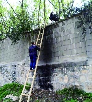 4月2日下午1時(shí)許,這位婦女打電話詢問(wèn)后稱,可以帶人過(guò)去,但需要交10元的車費(fèi)。記者同意后,這位婦女開(kāi)著摩的,將兩名記者拉到西安秦嶺野生動(dòng)物園旁的內(nèi)苑村村子里,在一個(gè)緊挨著圍墻的路邊,有三個(gè)年輕小伙子在墻邊架著4米多高的竹梯,三人陸續(xù)上墻頂后,將另外一個(gè)竹梯搭在另外一邊,其中一人坐在墻頂,另外兩人進(jìn)入園區(qū)內(nèi)看有無(wú)安保人員經(jīng)過(guò),確認(rèn)無(wú)誤后招呼記者上墻進(jìn)入園區(qū)(如圖)。