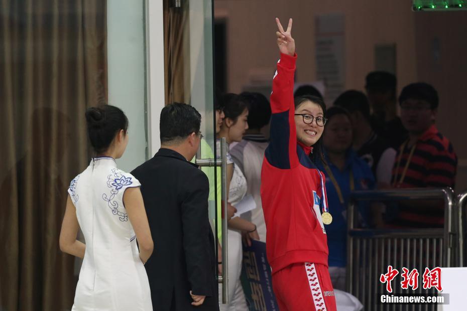 4月12日,傅園慧在頒獎儀式后向觀眾致意。當(dāng)日,在山東青島進(jìn)行的2017年全國游泳冠軍賽暨第十三屆全運(yùn)會預(yù)選賽女子100米仰泳決賽中,浙江選手傅園慧以58秒72的成績奪冠,并打破由她自己創(chuàng)下的該項(xiàng)目全國紀(jì)錄。 中新社記者 韓海丹 攝