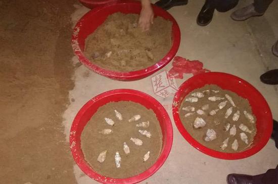 殷祖鎮(zhèn)政府工作人員與派出所民警來到陳敦煌家里時(shí),陳敦煌并不承認(rèn)自己挖到了什么“寶貝”。經(jīng)過工作人員幾個(gè)小時(shí)苦口婆心的疏導(dǎo),陳敦煌終于同意將“寶貝”交了出來。不看不知道,一看嚇一跳。原來陳敦煌挖到的這些“寶貝”,是一堆銹跡斑斑的炮彈頭。經(jīng)工作人員現(xiàn)場清點(diǎn),陳敦煌挖到的炮彈頭共有161枚,其中小型炮彈頭147枚、大型炮彈頭14枚。