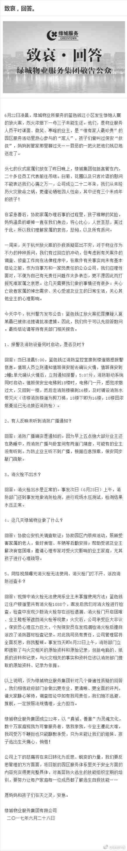 人民網(wǎng)北京6月29日電 杭州"保姆縱火致4死案"近日備受關(guān)注。針對火災(zāi)發(fā)生后有住戶質(zhì)疑小區(qū)的消防設(shè)備存在問題,涉事的綠城物業(yè)今日凌晨在其官方微博回應(yīng)表示,凌晨5時小區(qū)物業(yè)監(jiān)控室接到樓道煙感報警信息,7分鐘后消防聯(lián)動系統(tǒng)同時啟動,消防廣播也有通知。此外,綠城物業(yè)承認(rèn),火災(zāi)后個別保安員在發(fā)現(xiàn)漏檢消火栓后擅自涂改了消防器材檢查記錄。