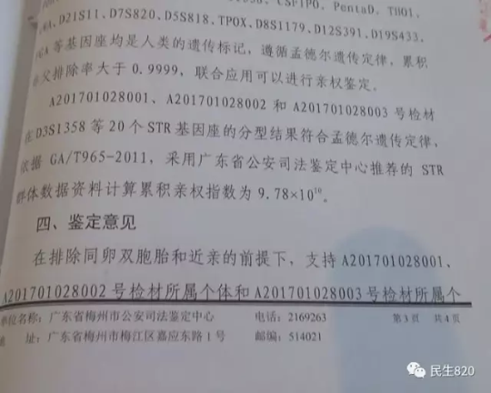 記者從梅州市公安司法鑒定中心DNA檢驗(yàn)鑒定意見中看到,經(jīng)鑒定,王某昌與繩某玲所生女嬰為:符合親生關(guān)系。