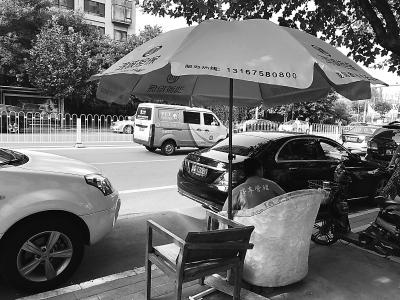 順著停車(chē)帶往東走,會(huì)看到身穿橙色制服的幾名男子騎著電動(dòng)自行車(chē)來(lái)回巡視,每當(dāng)有車(chē)從停車(chē)位開(kāi)走,或者準(zhǔn)備停車(chē)時(shí),他們就會(huì)上前,從車(chē)的前擋風(fēng)玻璃取下小紙條,按上面的時(shí)間收錢(qián)。在這條路中段的人行道上,立著一把黃色的大傘,傘下面擺著兩把椅子,一名身穿淺藍(lán)色上衣的男子正在路邊喝水,所穿的衣服后背上印著“停車(chē)管理”四個(gè)字。他告訴記者:“這條路兩側(cè)路邊停車(chē)都是要收費(fèi)的,第一個(gè)小時(shí)6元,第二個(gè)小時(shí)9元!彼f(shuō)因同村的老鄉(xiāng)有事,所以臨時(shí)來(lái)替他上幾天班。他指了指頭頂?shù)恼陉?yáng)傘說(shuō),這把傘和沙發(fā)都是路邊一家金融公司提供的。