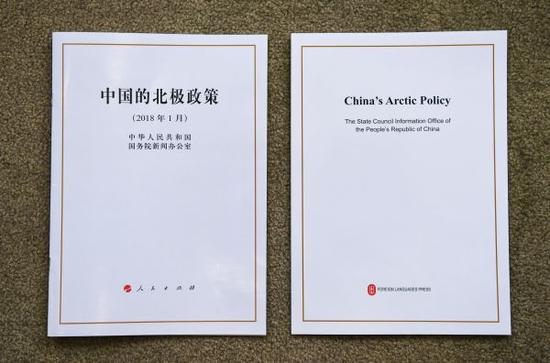 資料圖片:《中國(guó)的北極政策》白皮書中文版(左)和英文版(1月26日攝)。新華社記者 申宏 攝