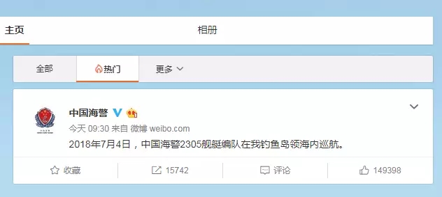 4日,中國海警局官方微博發(fā)出第一條微博,宣布2018年7月4日,中國海警2305艦艇編隊(duì)在我釣魚島領(lǐng)海內(nèi)巡航。(@中國海警)