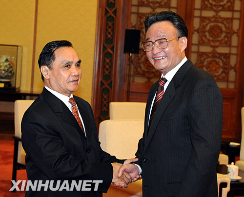 新華網(wǎng)北京3月24日電(記者榮燕、徐松)全國人大常委會(huì)委員長吳邦國、國務(wù)院總理溫家寶24日在人民大會(huì)堂分別會(huì)見了老撾國會(huì)主席通辛。