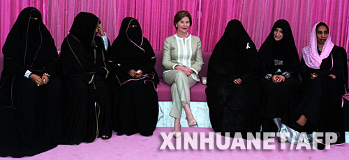 10月22日,美國第一夫人勞拉·布什(中)在阿拉伯聯(lián)合酋長國首都阿布扎比的一個醫(yī)護中心與乳腺癌患者座談。勞拉·布什于20日晚啟程前往中東,開始“粉色之旅”,旨在推動中東地區(qū)乳腺癌防治知識的普及,同時改善美國在該地區(qū)的形象。 新華社/法新