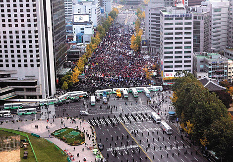 11月11日,韓國數(shù)萬人在首都示威,引發(fā)大規(guī)模沖突。