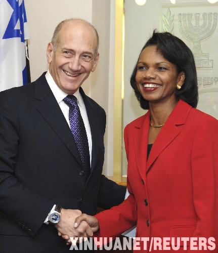 資料圖片:10月14日,以色列總理奧爾默特(左)在耶路撒冷會(huì)見到訪的美國國務(wù)卿賴斯。賴斯當(dāng)日上午在抵達(dá)以色列開始新一輪中東外交斡旋時(shí)說,她此行旨在為11月召開的中東問題國際會(huì)議做準(zhǔn)備,敦促以色列和巴勒斯坦政府在草擬聯(lián)合聲明的過程中盡量減少隔閡。但她預(yù)計(jì)這次外交斡旋成果將有限。 新華社/路透