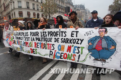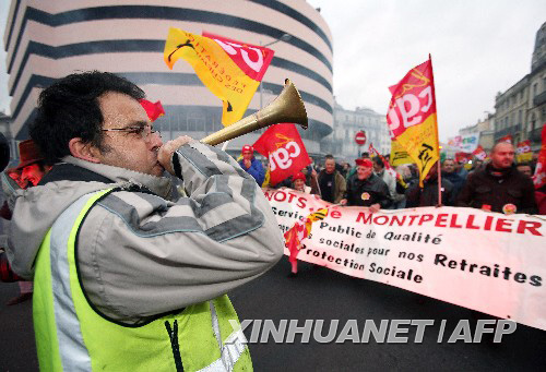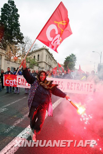 11月20日,在法國蒙彼利埃,一名女子揮舞法國總工會的旗幟參加游行。法國八大公務員聯合會當日發(fā)起預定24小時的罷工,將已經持續(xù)一周的法國大罷工推入新階段。這次公務員罷工的目的是要求政府增加工資,并抗議政府作出的2008年取消2.29萬公務員職位的決定。 新華社/法新