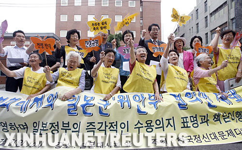 資料圖片:7月31日,在韓國首都首爾的日本駐韓國大使館前,在第二次世界大戰(zhàn)期間曾被日本軍隊強(qiáng)征為“慰安婦”的韓國婦女(前排)與支持者高喊口號,要求日本政府正式道歉。美國國會眾議院30日以口頭表決方式,一致通過了一項譴責(zé)日本在二戰(zhàn)期間強(qiáng)征亞洲其他國家婦女充當(dāng)日軍“慰安婦”的議案,要求日本政府以正式、明確的方式承認(rèn)“慰安婦”問題,就這一問題進(jìn)行道歉,并承擔(dān)相應(yīng)的歷史責(zé)任。新華社/路透