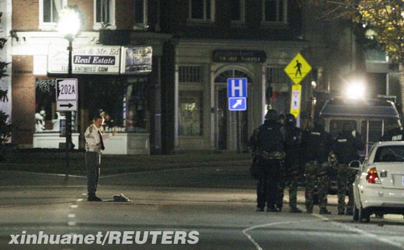 11月30日,在美國新罕布什爾州的羅切斯特,一位名叫艾森伯格的嫌疑人(左)在美國民主黨總統(tǒng)候選人希拉里競選辦公室外出現(xiàn),然后這名男子向警方投降。據(jù)美國有線電視新聞網(wǎng)報(bào)道,一名自稱攜帶炸彈的男子當(dāng)天闖入美國民主黨總統(tǒng)候選人希拉里·克林頓設(shè)在新罕布什爾州羅切斯特的一個(gè)競選辦公室,并劫持了兩名人質(zhì)。而希拉里本人當(dāng)天則不在該州。 新華社/路透