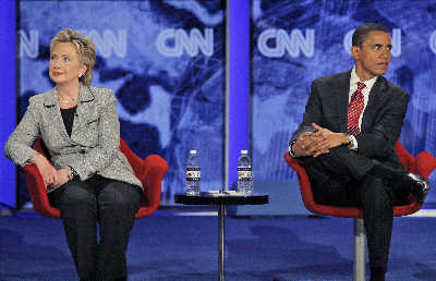 民主黨總統(tǒng)候選人希拉里(左)和奧巴馬在辯論會(huì)上(右)交鋒。IC圖