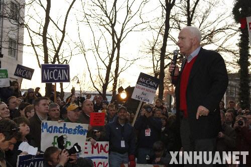 1月7日,美國共和黨總統(tǒng)競選人、亞利桑那州國會參議員約翰·麥凱恩(右)在新罕布什爾州的曼徹斯特發(fā)表競選演說。新罕布什爾州將于8日舉行2008年美國總統(tǒng)選舉的直接預選。 新華社記者張巖攝