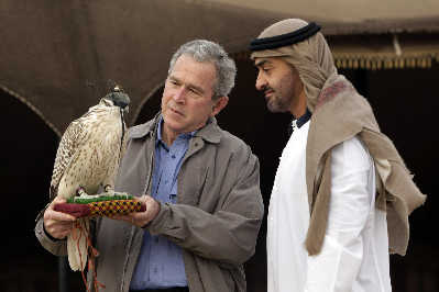 1月13日,阿聯(lián)酋,到訪(fǎng)的美國(guó)總統(tǒng)布什和阿聯(lián)酋王儲(chǔ)扎耶德·阿勒那哈揚(yáng)在皇家俱樂(lè)部賞玩獵鷹。