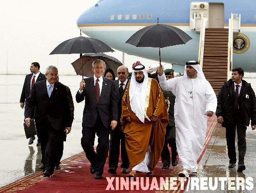 1月13日,阿聯(lián)酋總統(tǒng)哈利法(中)在阿布扎比迎接剛剛抵達(dá)的美國(guó)總統(tǒng)布什(左二)。布什當(dāng)天上午抵達(dá)阿布扎比,開(kāi)始對(duì)阿拉伯聯(lián)合酋長(zhǎng)國(guó)進(jìn)行為期兩天的訪(fǎng)問(wèn)。阿聯(lián)酋是布什此次中東之行的第五站。 新華社/路透