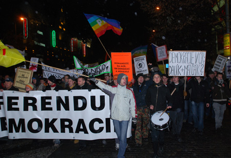 捷克各地爆發(fā)多次示威游行,反對美國在捷克領(lǐng)土上建立雷達基地。圖為去年11月17日2000多民眾走上布拉格街頭抗議政府拒絕聽從民意,繼續(xù)與華盛頓談判導彈基地協(xié)定。(資料圖片 攝影 黃頻)