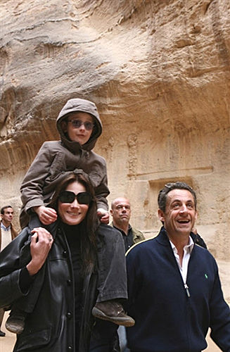 1月5日,法國總統(tǒng)尼古拉·薩科齊與布呂尼母子在約旦佩特拉古跡參觀