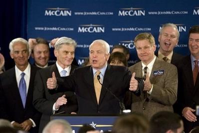美國(guó)總統(tǒng)大選共和黨參選人麥凱恩在獲得弗吉尼亞州、馬里蘭州和華盛頓特區(qū)的初選勝利后,與支持者們一起歡呼。