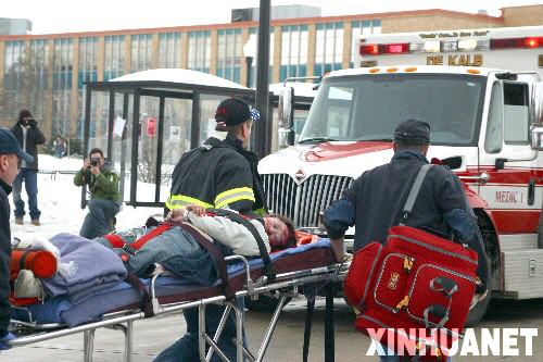 2月14日,在美國伊利諾伊州迪卡爾布縣的北伊利諾伊大學(xué),救援人員從槍擊現(xiàn)場抬出一名受害者。當(dāng)日,這所大學(xué)內(nèi)發(fā)生槍擊事件,造成10多人中槍,其中3至4人頭部受傷。 新華社發(fā)